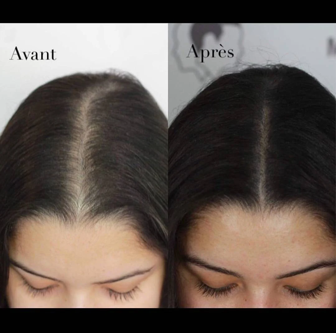 Ce traitement restaure visuellement la densité, adoucit les contrastes entre les cheveux et le cuir chevelu, et redonne l’impression d’une chevelure pleine et volumineuse — tout en respectant la finesse du résultat.
