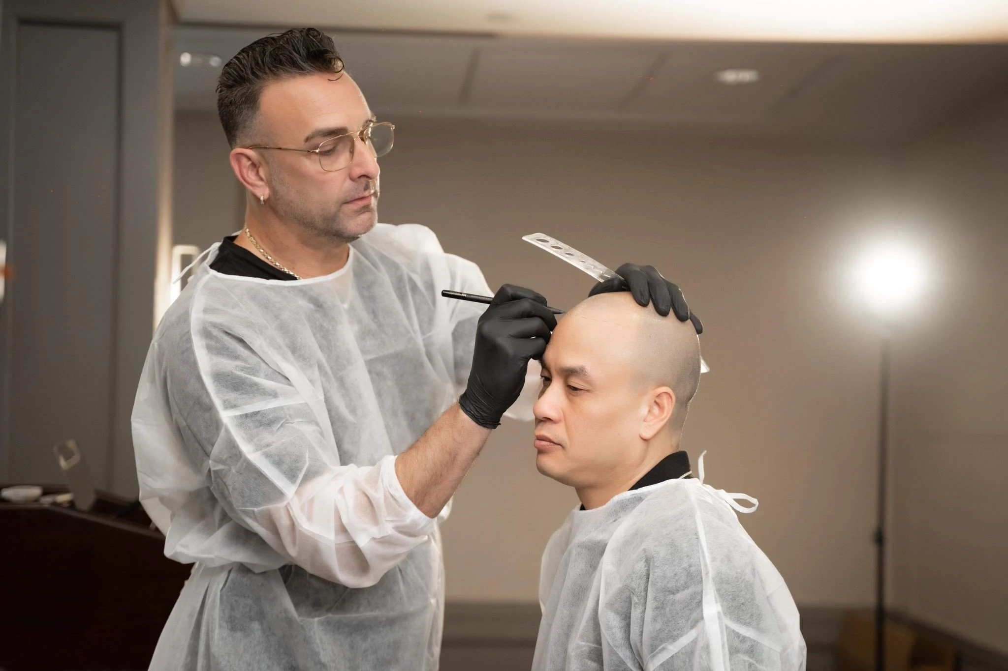 La micropigmentation capillaire permet de redessiner une ligne frontale précise ou de recréer l’apparence d’un cuir chevelu rasé, tout en ajoutant de la densité dans les zones dégarnies.